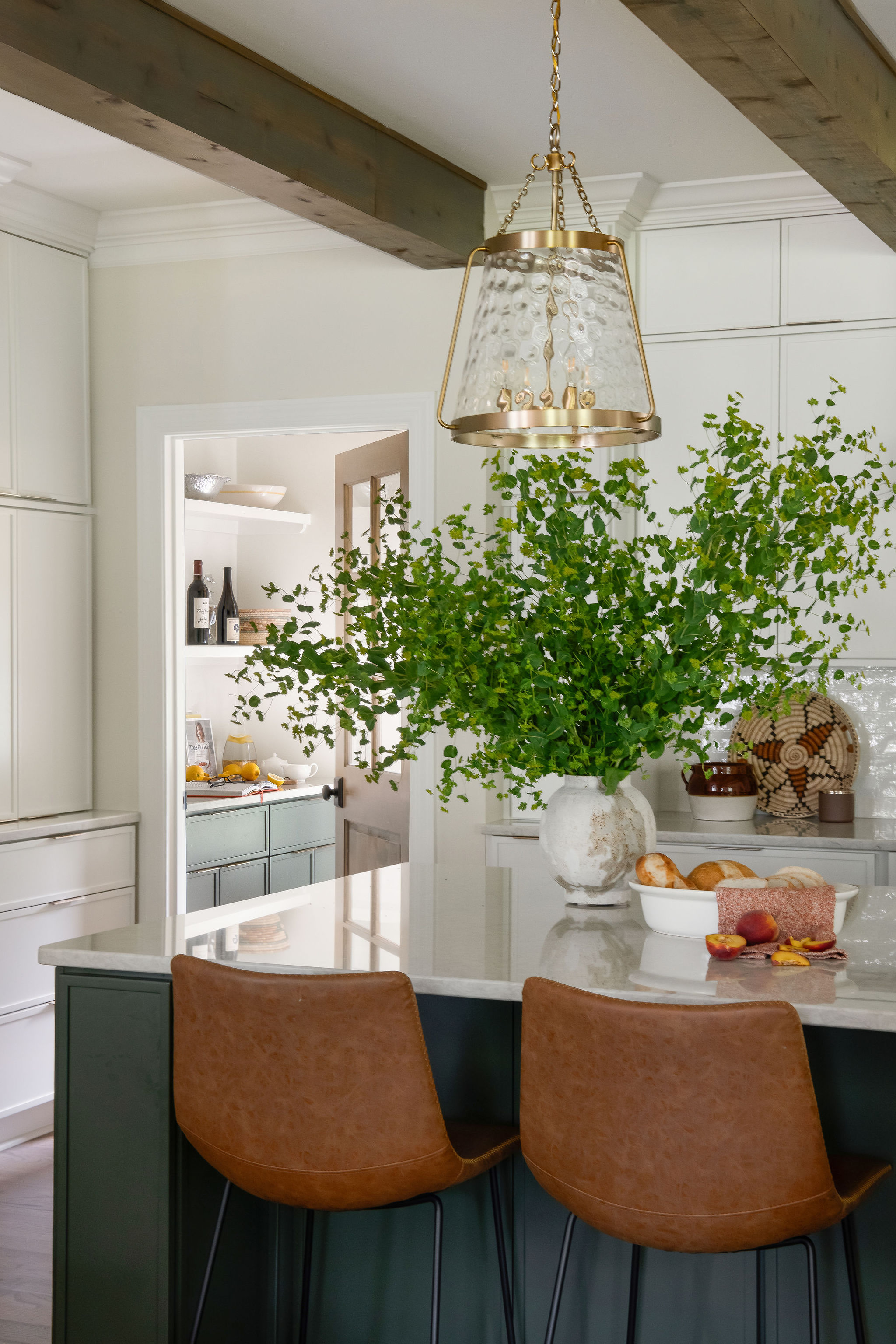 - The kitchen became the true heart of the home, with a stunning island, custom range wall, and pantry door that combine everyday functionality with warmth and beauty.