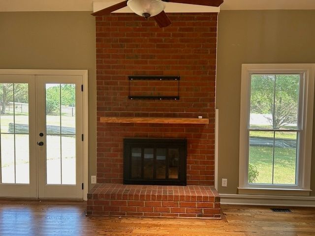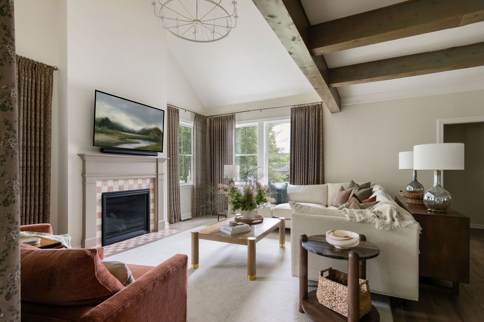 Once defined by dark brick and heavy tones, this living room was completely transformed into a light-filled space that feels both welcoming and refined. The redesign replaced the dated red brick with a custom-painted fireplace surround and patterned tile hearth that add softness and subtle texture. Warm, layered textiles, tailored drapery, and comfortable seating now anchor the room, creating a place that invites gathering and conversation.