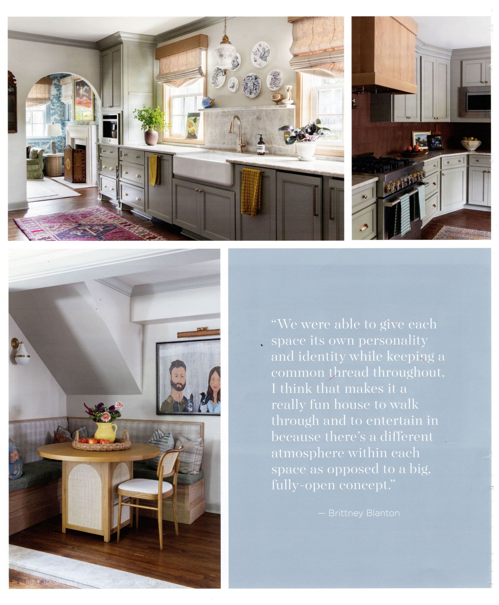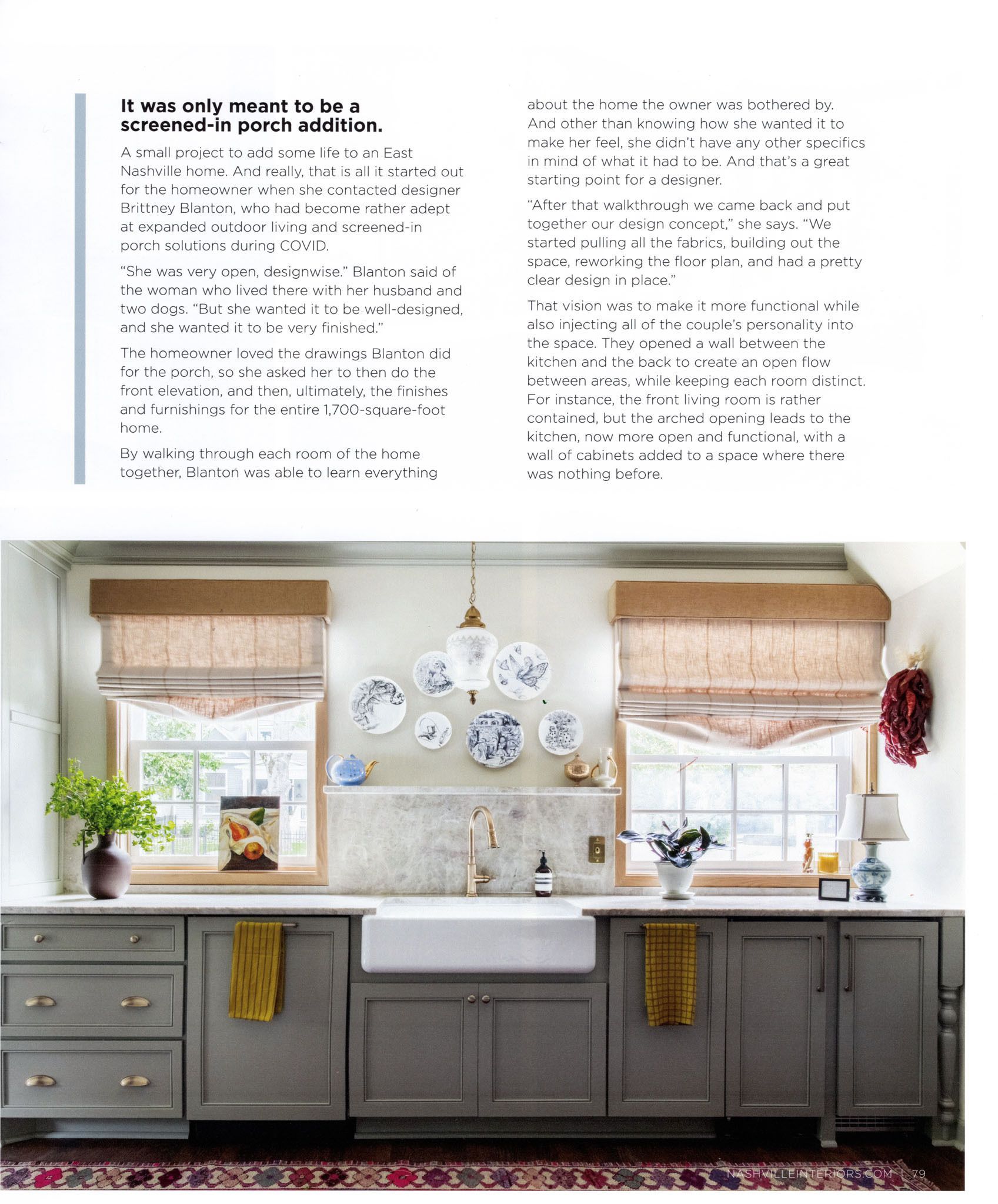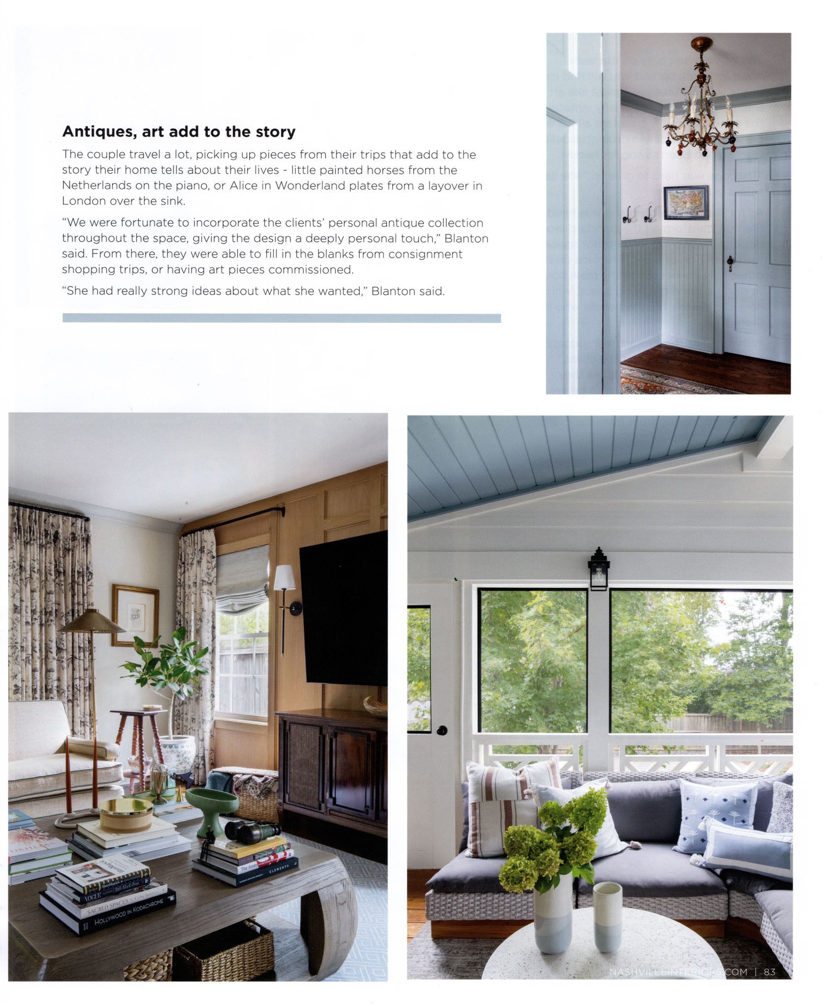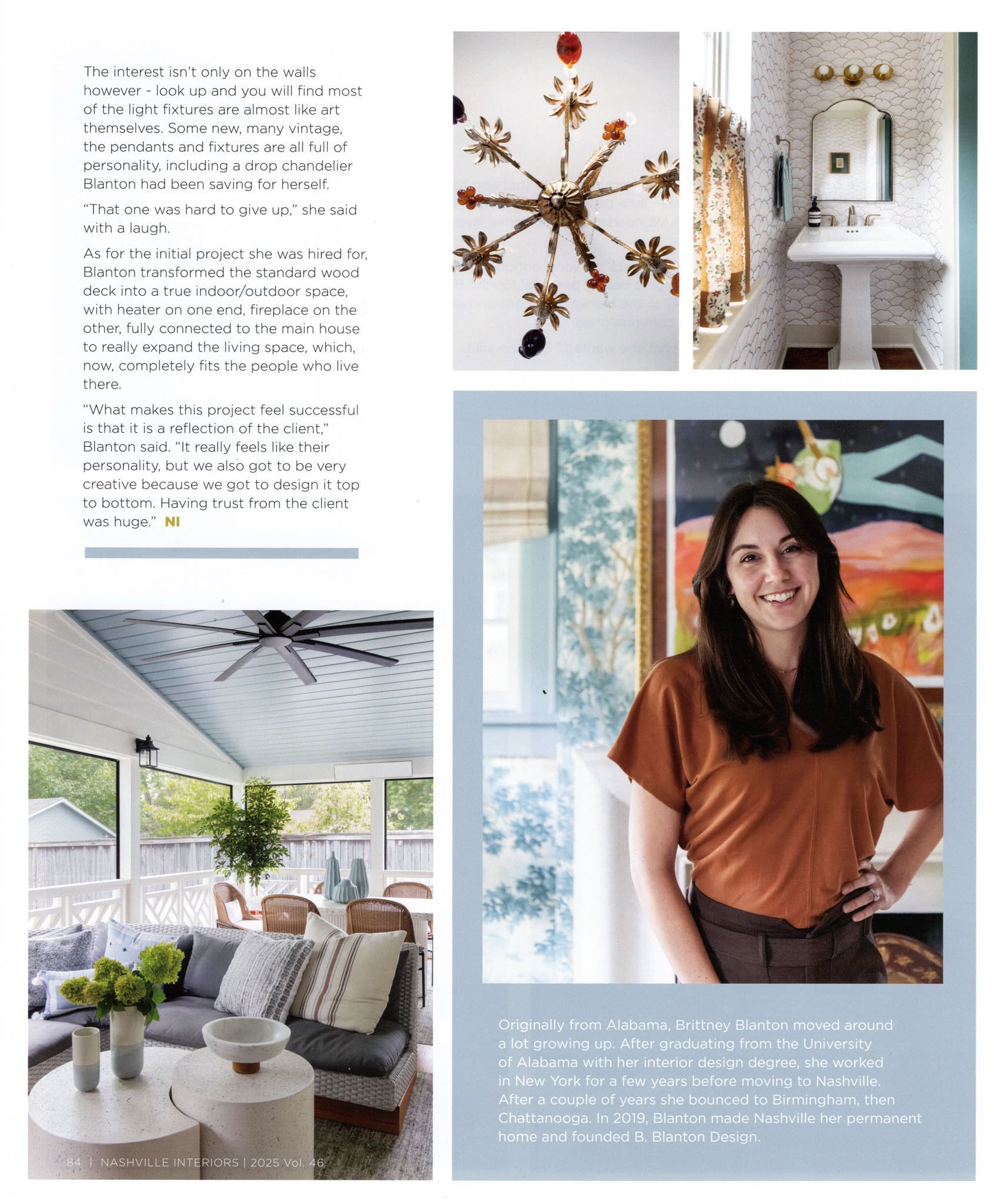Nashville Interiors magazine featured B Blanton Design for a standout East Nashville home renovation. The article spotlights Brittney Blanton's ability to blend historic charm with modern function, using antiques, custom finishes, and personalized details. The feature positions B Blanton Design as a leading Nashville interior designer known for thoughtful, client focused spaces.